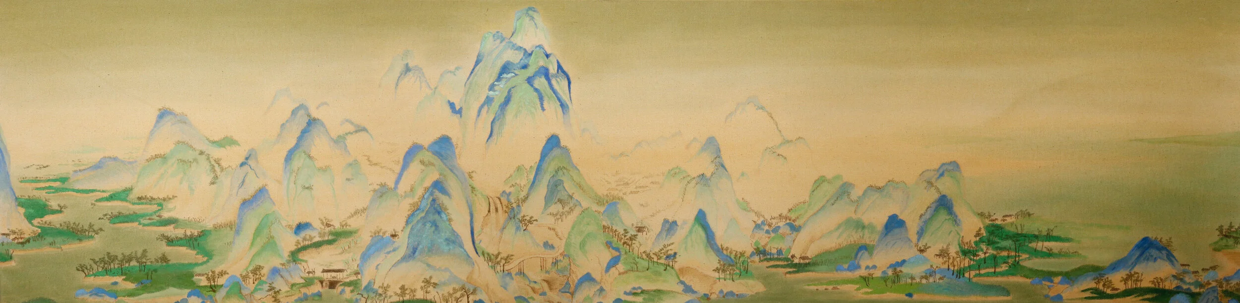Study of Wang Ximeng's "A Thousand Li of Rivers and Mountains" (千里江山图), 2018, Oil on unprimed canvas and wood board, 12 x 48 in